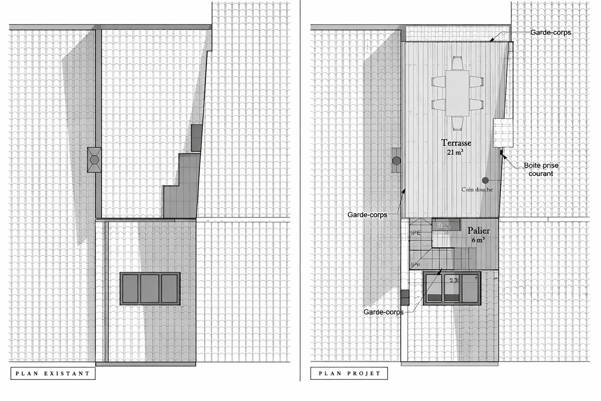 Le projet a consisté à transformer d’anciens combles perdus et une toiture existante en une véritable terrasse de plain‑pied, accessible par un escalier de type tropézienne (léger et élégant).
